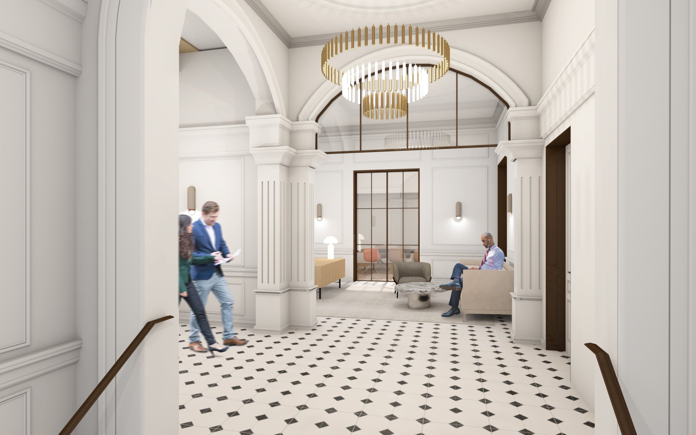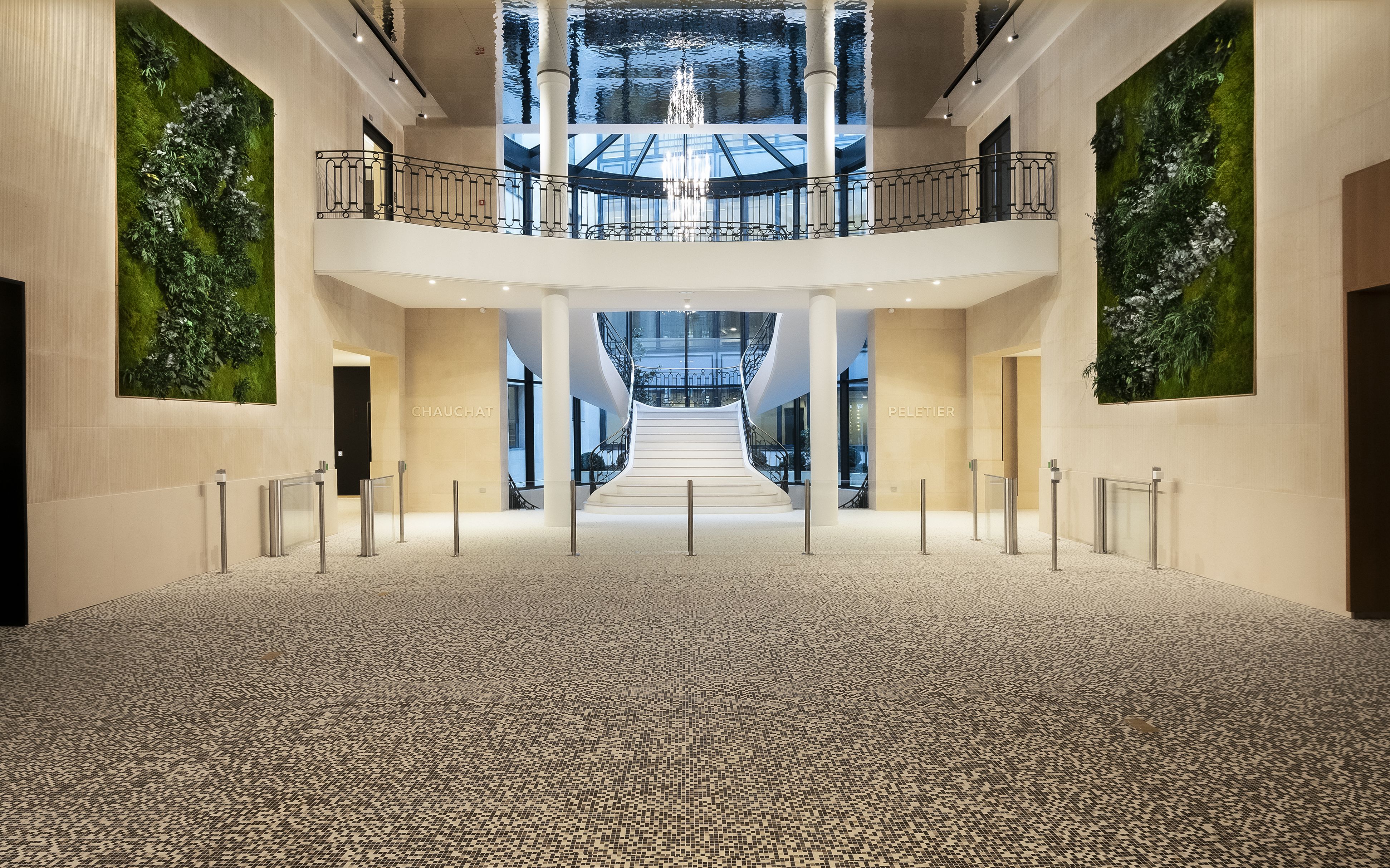 Dans le respect des richesses de l'immeuble le hall est transformé afin de créer un vrai espace accueil mêlant un sol en pierre à cabochons et des larges portes vitrées à ossatures métalliques bronze patiné. Dans les plateaux la technique est intégrée afin de conservé l'esprit parquet moulures du lieu.