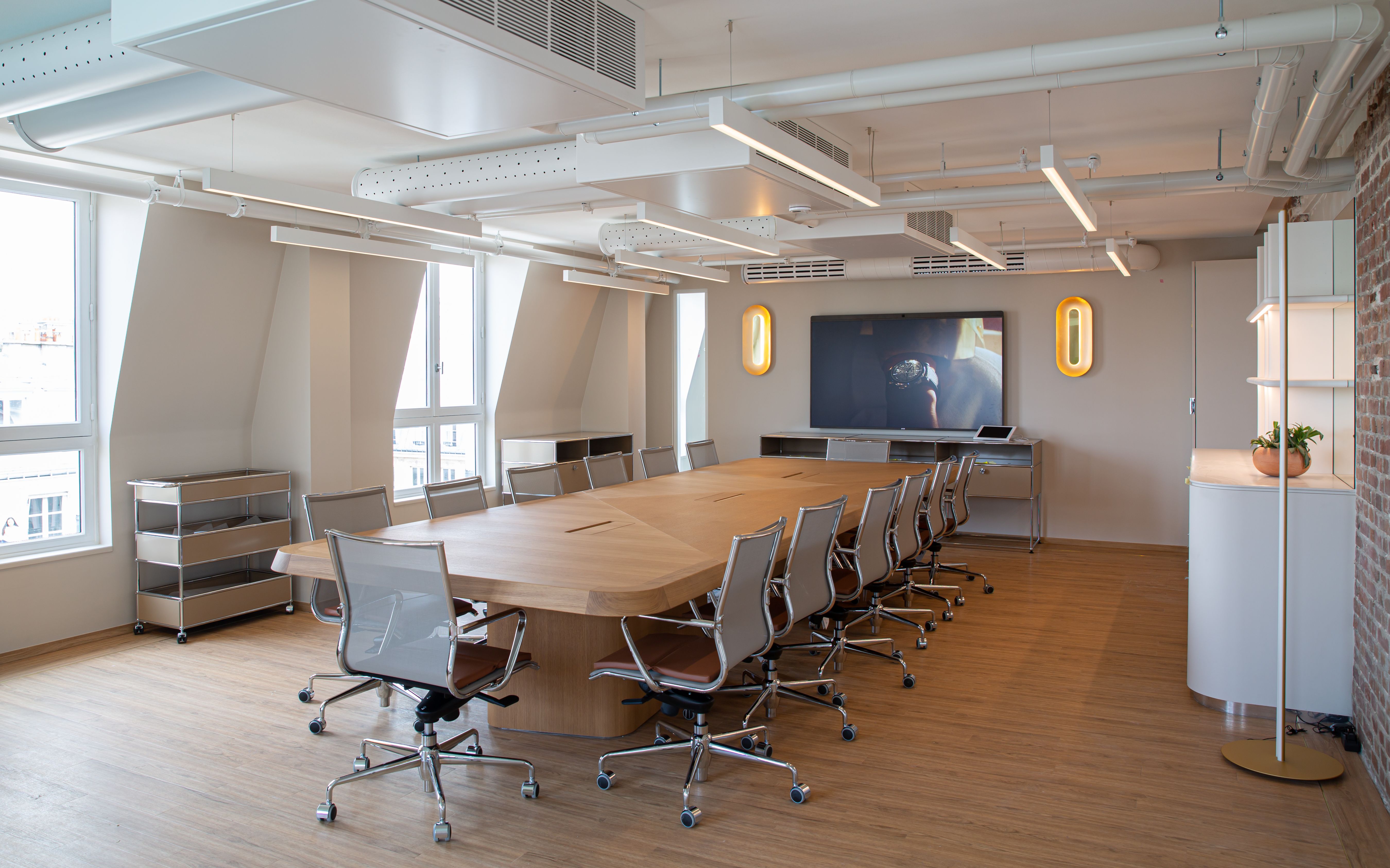 Composés de lignes pures, d’ouvertures et de transparences, les aménagements résolument contemporains dialoguent avec les richesses haussmanniennes du lieu.