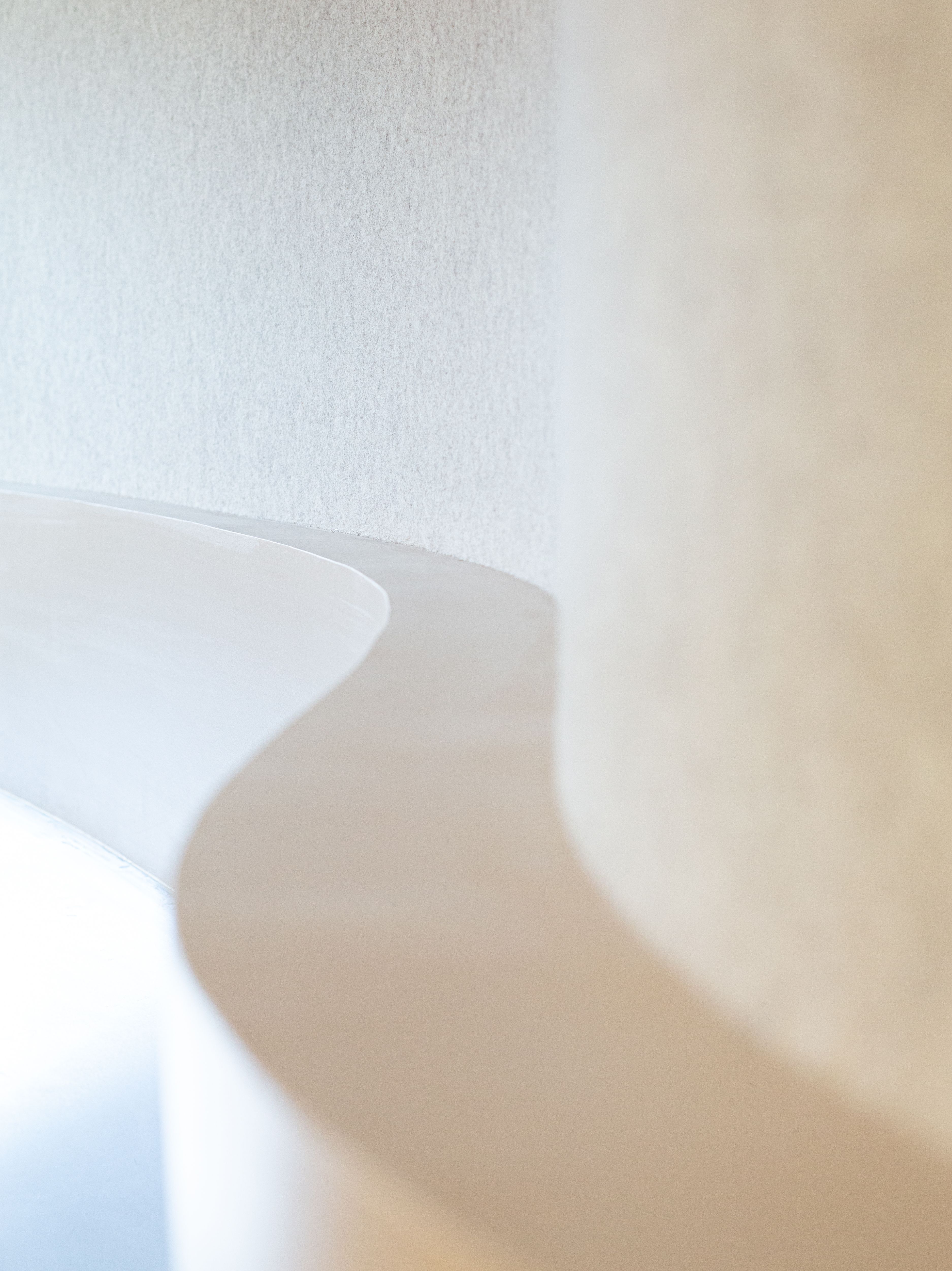 Composés de courbes de béton et de feutres, les murs se font banquettes, alcôves, cuisine ou rangements dissimulés pour mieux brouiller les repères.