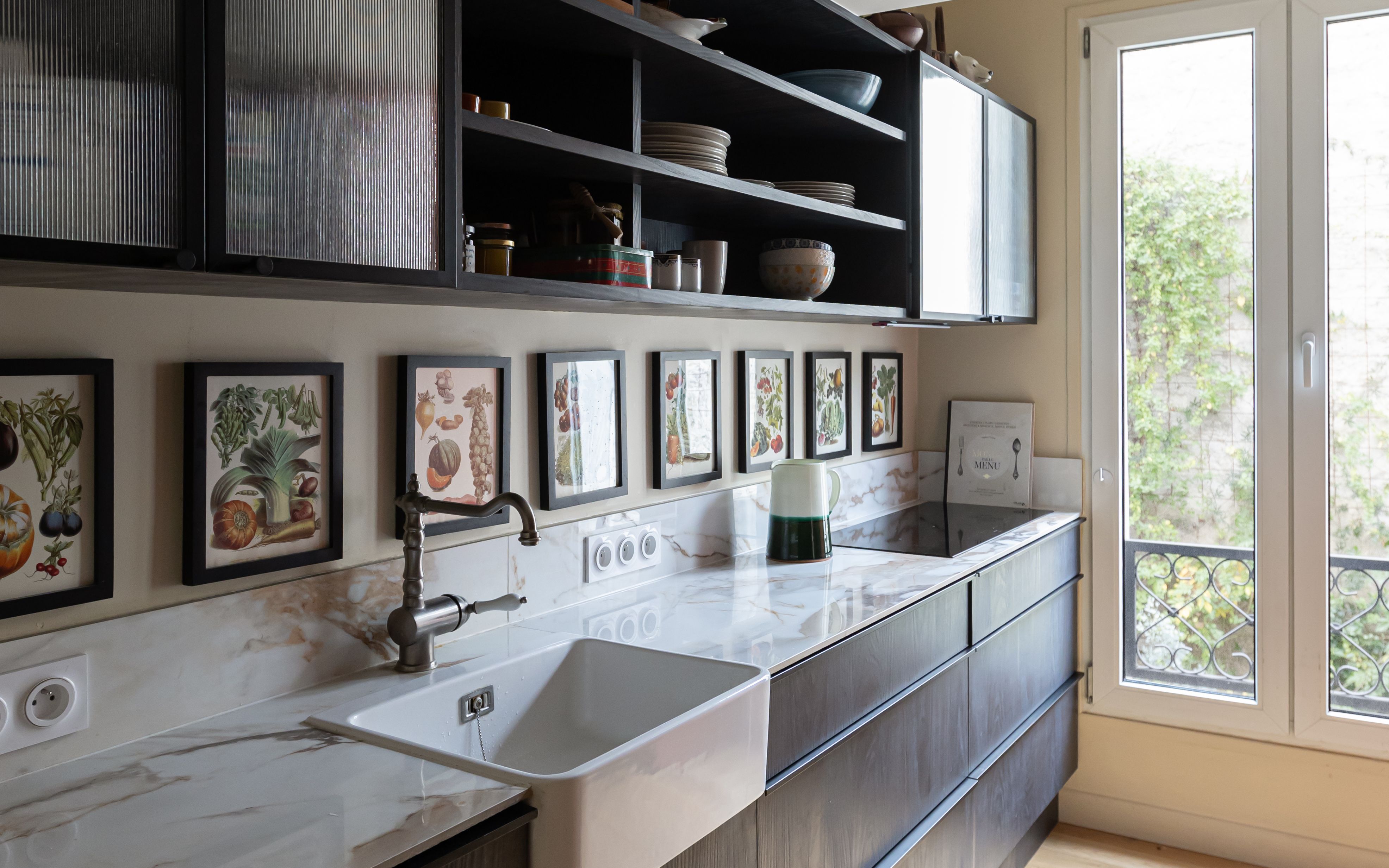 Au pied de la Tour Eiffel, niché en haut d'un bel immeuble Haussmannien, cet appartement nécessitait un réaménagement complet.