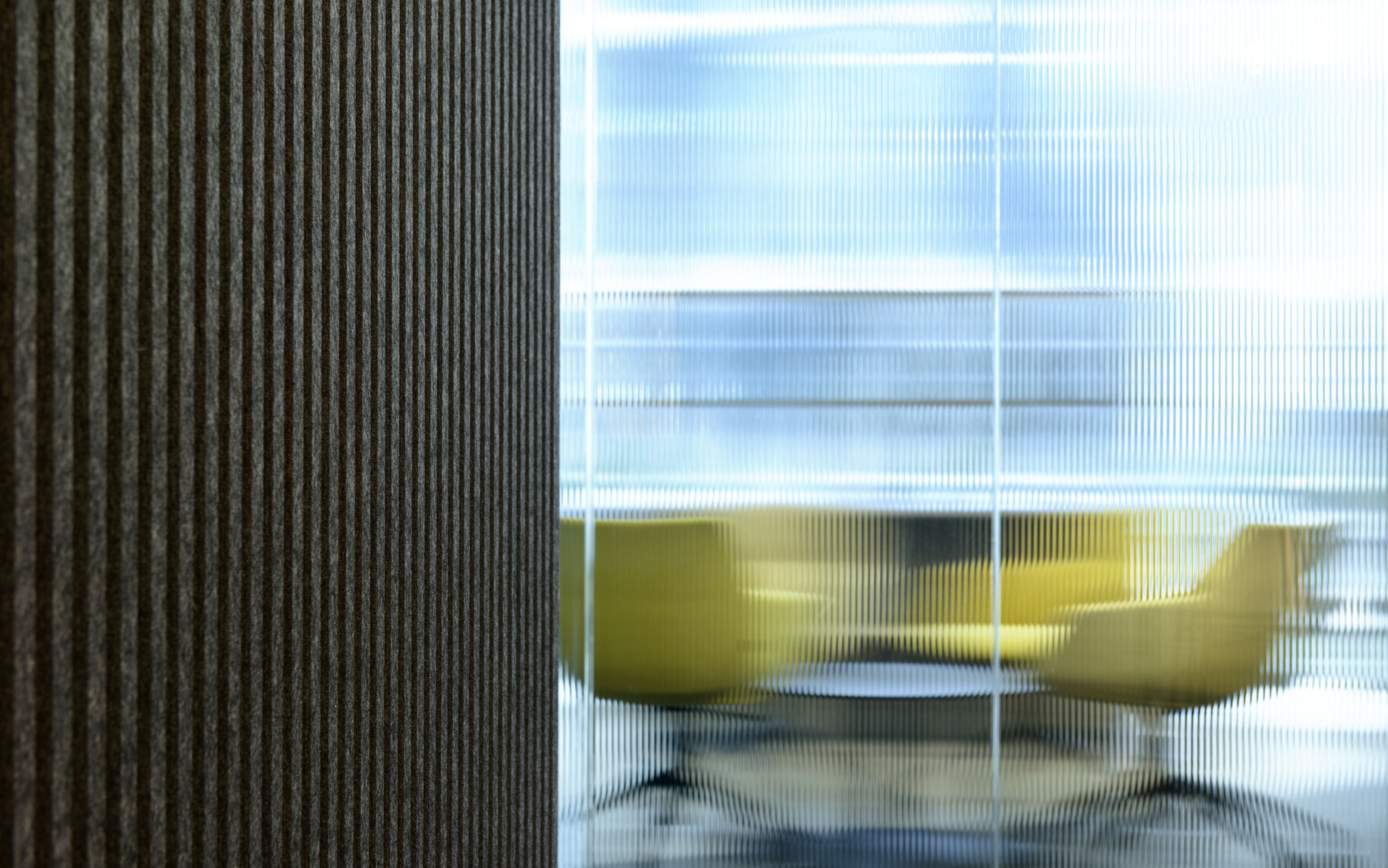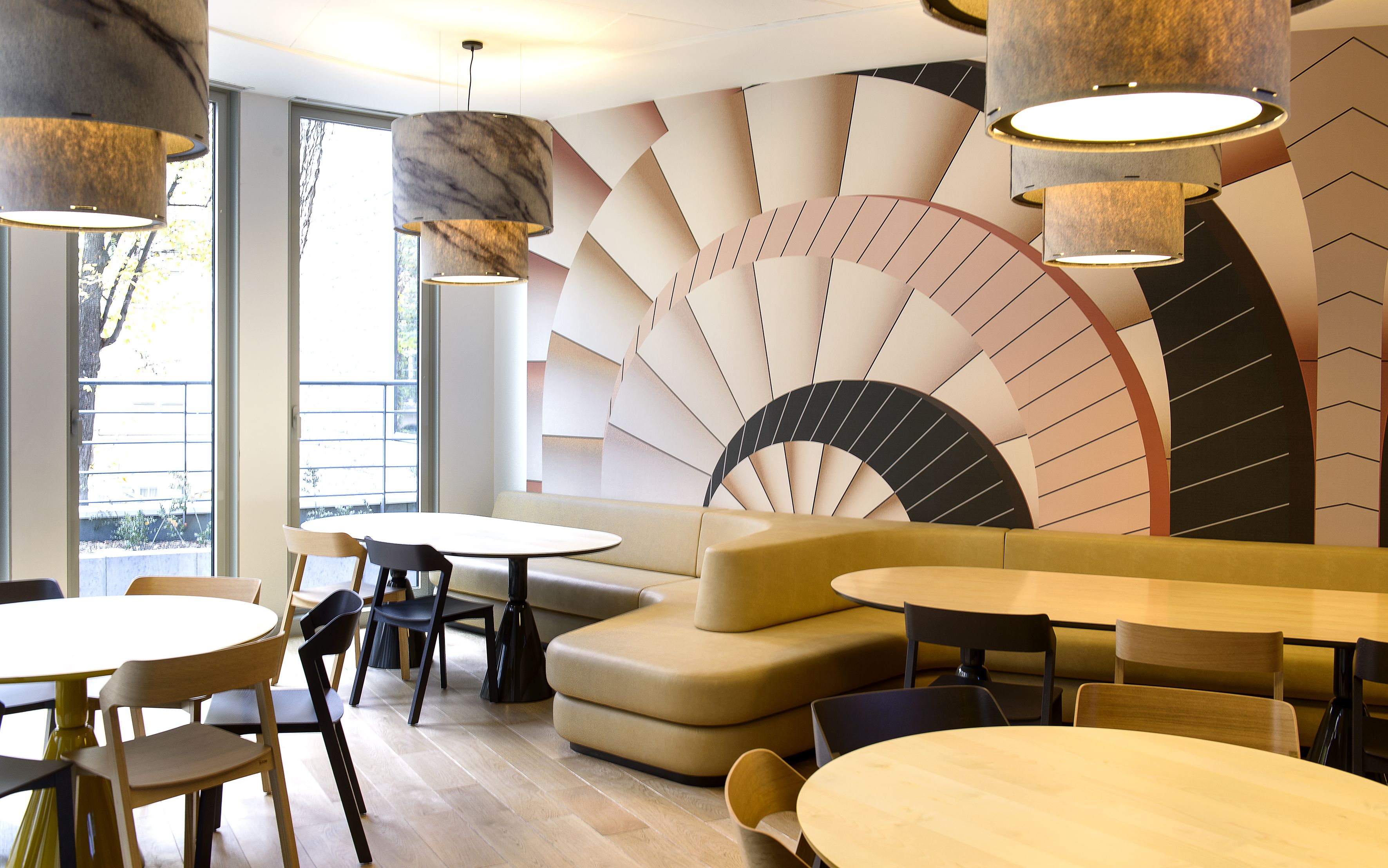 Béton, métal, marbre blanc, bois noir, verre imprimé et nappe de bois ondulée se mêlent dans une architecture inventive pour créer une identité forte.