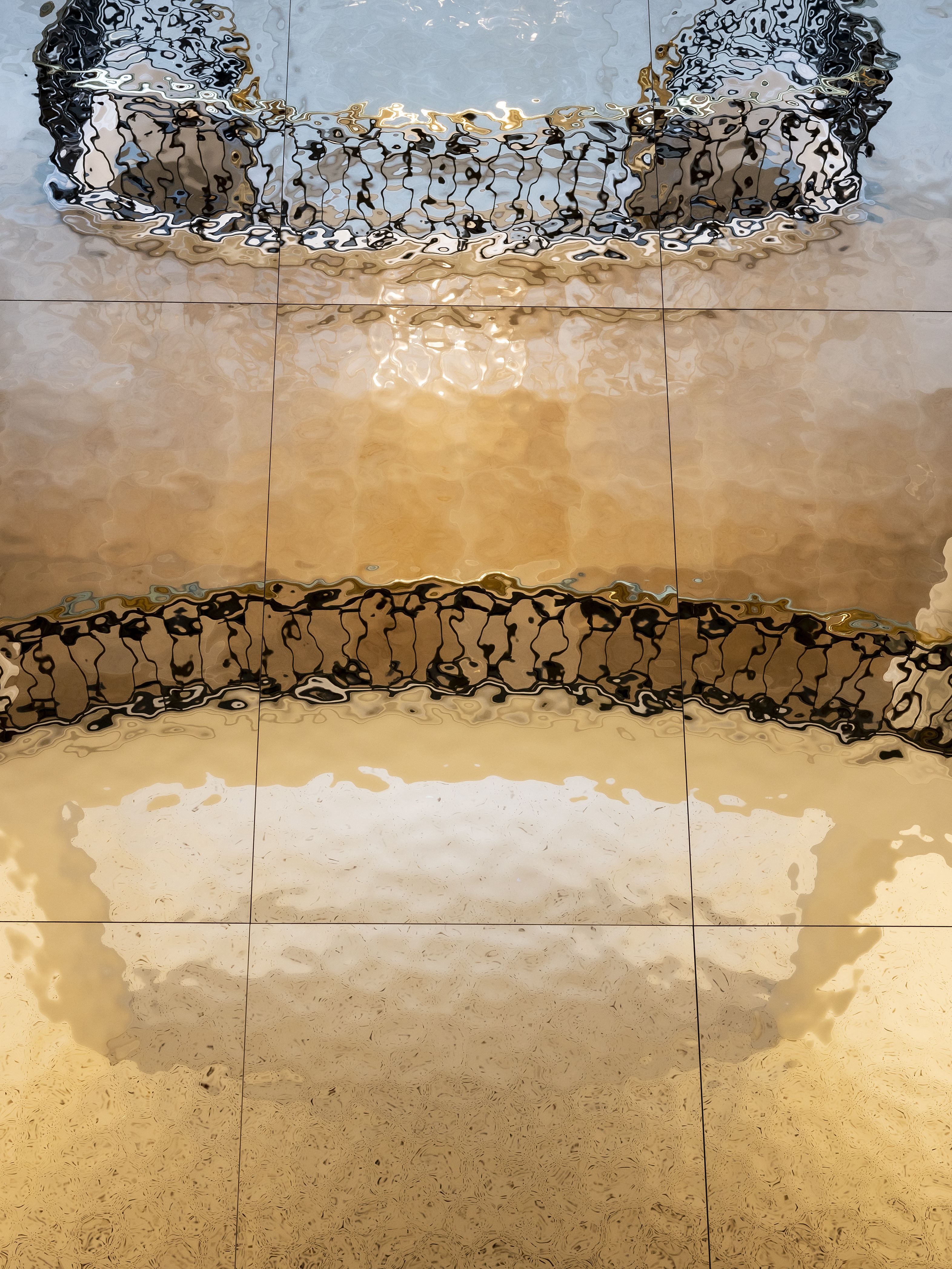 Renversant les perspectives, le plafond en inox poli agit comme une étendue d’eau suspendue.