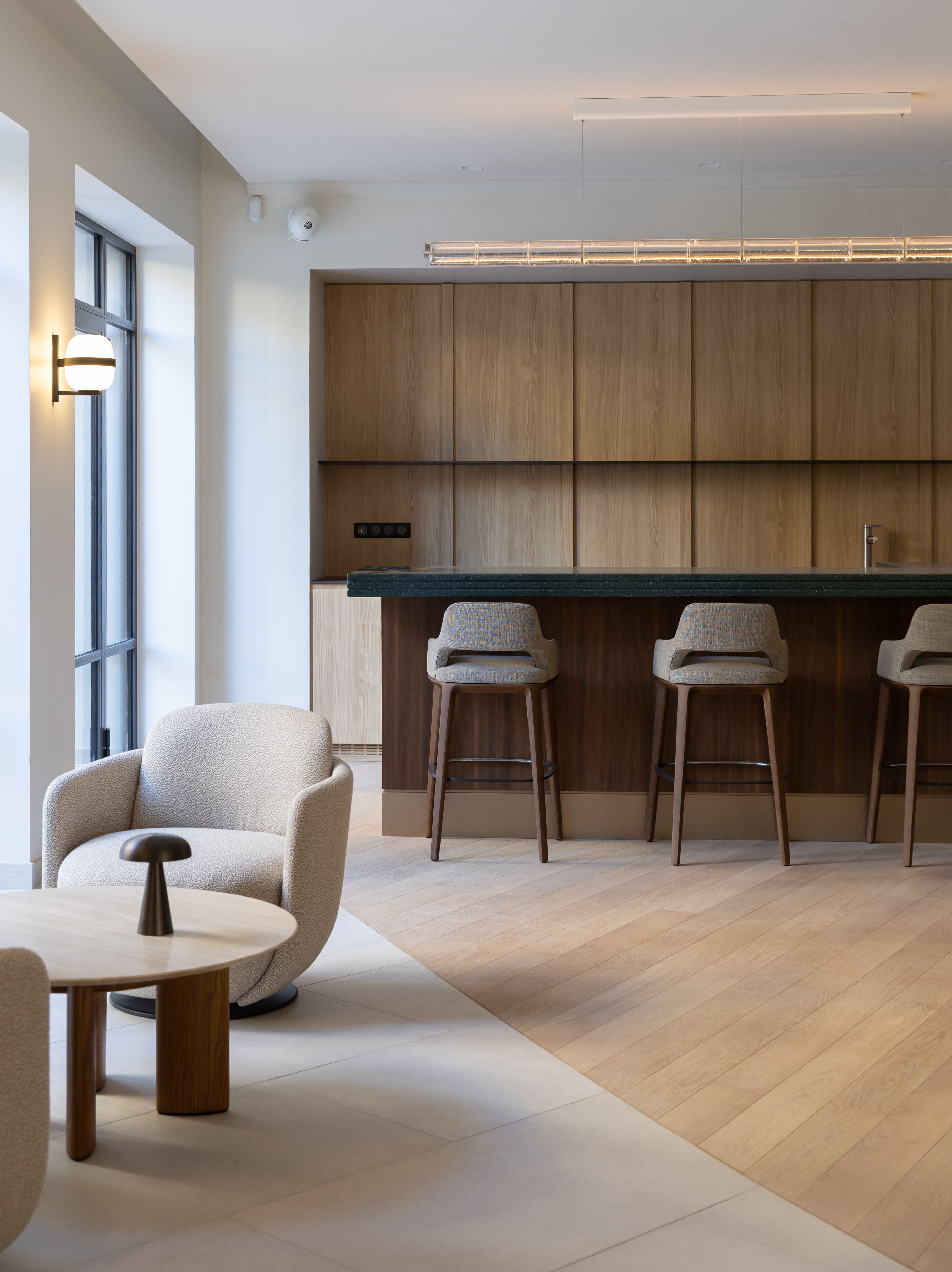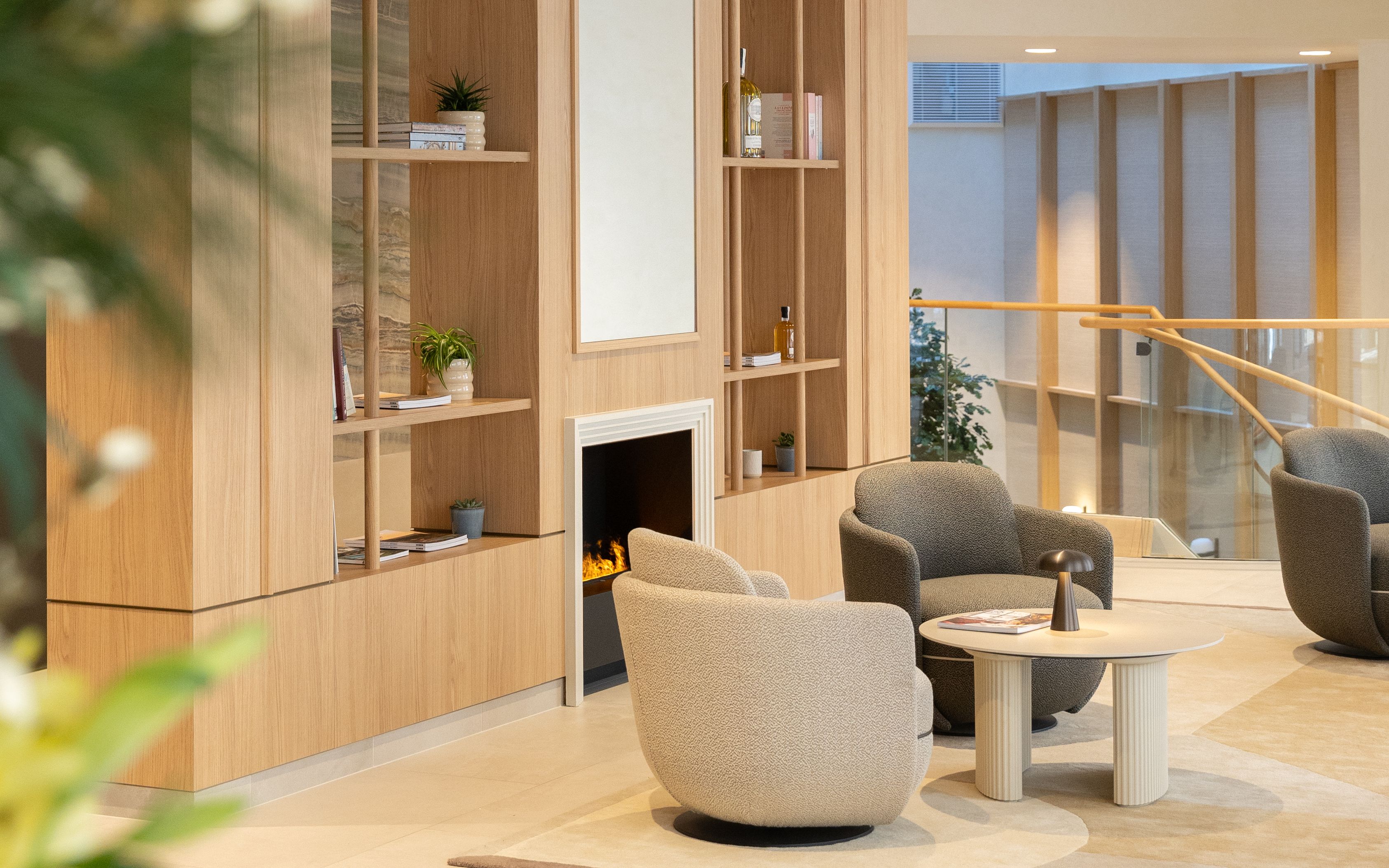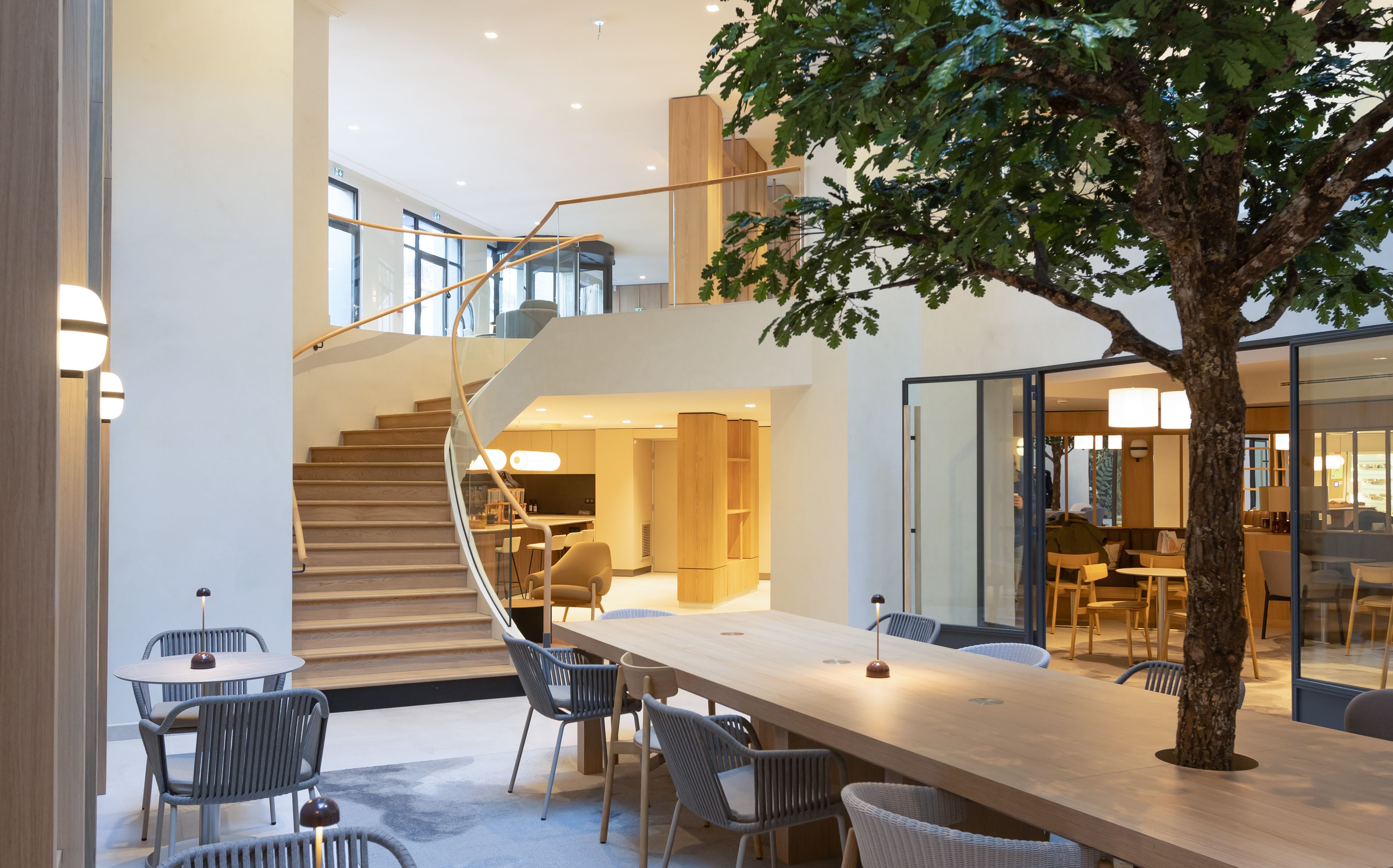 La réalisation d’un escalier monumental reliant la réception et le Patio a permis la transformation de ce lieu sombre et délaissé en véritable coeur de l’immeuble.