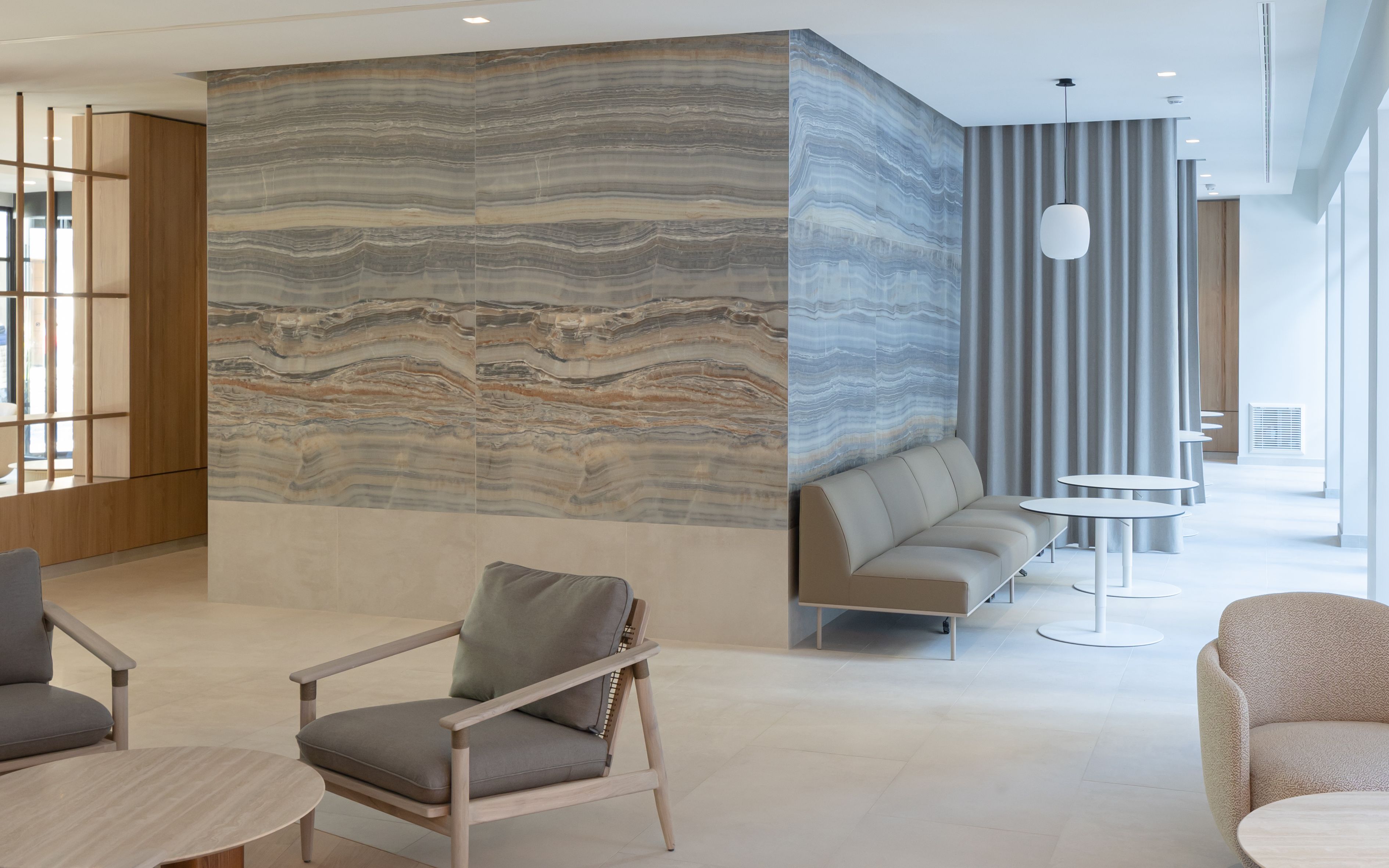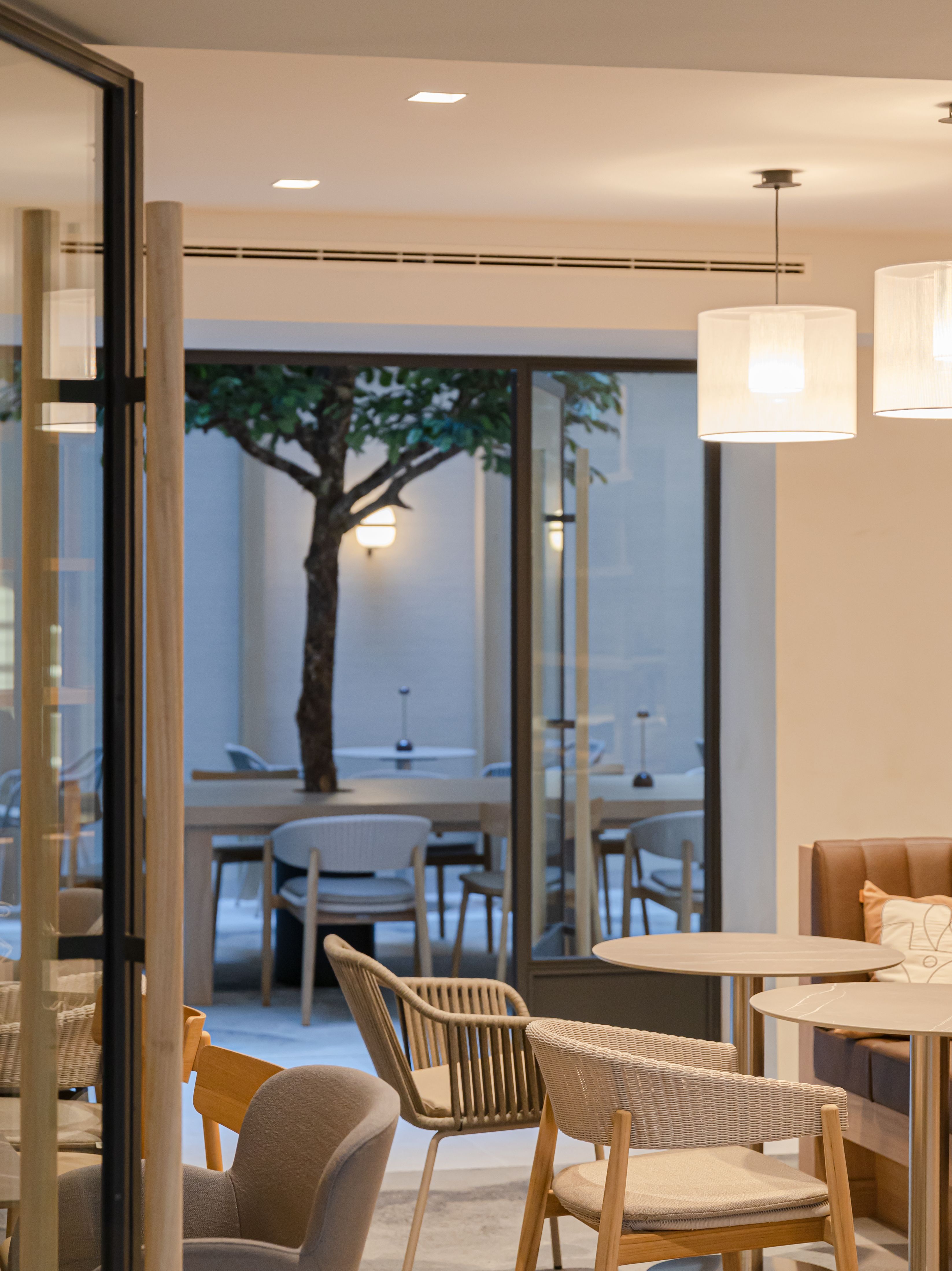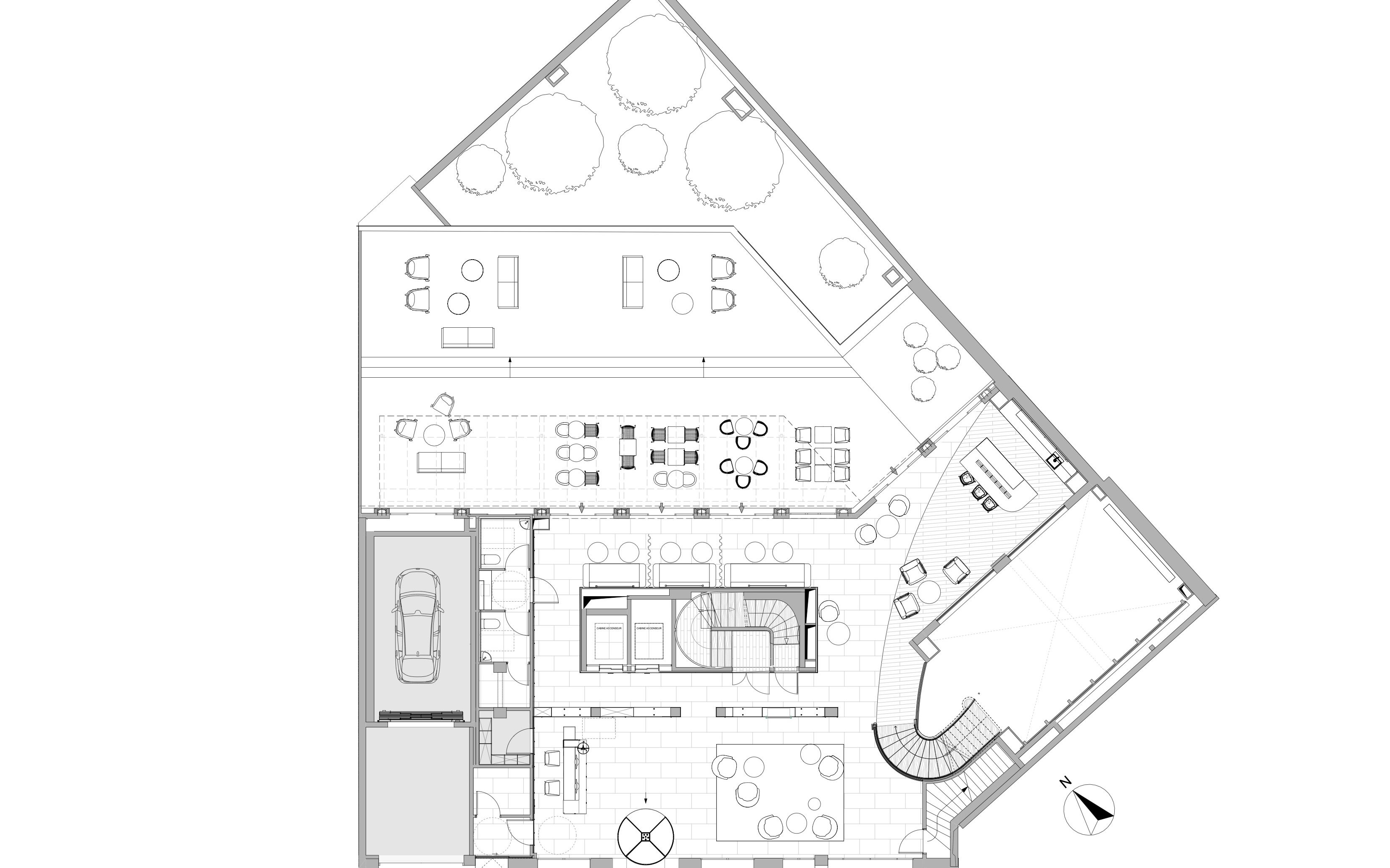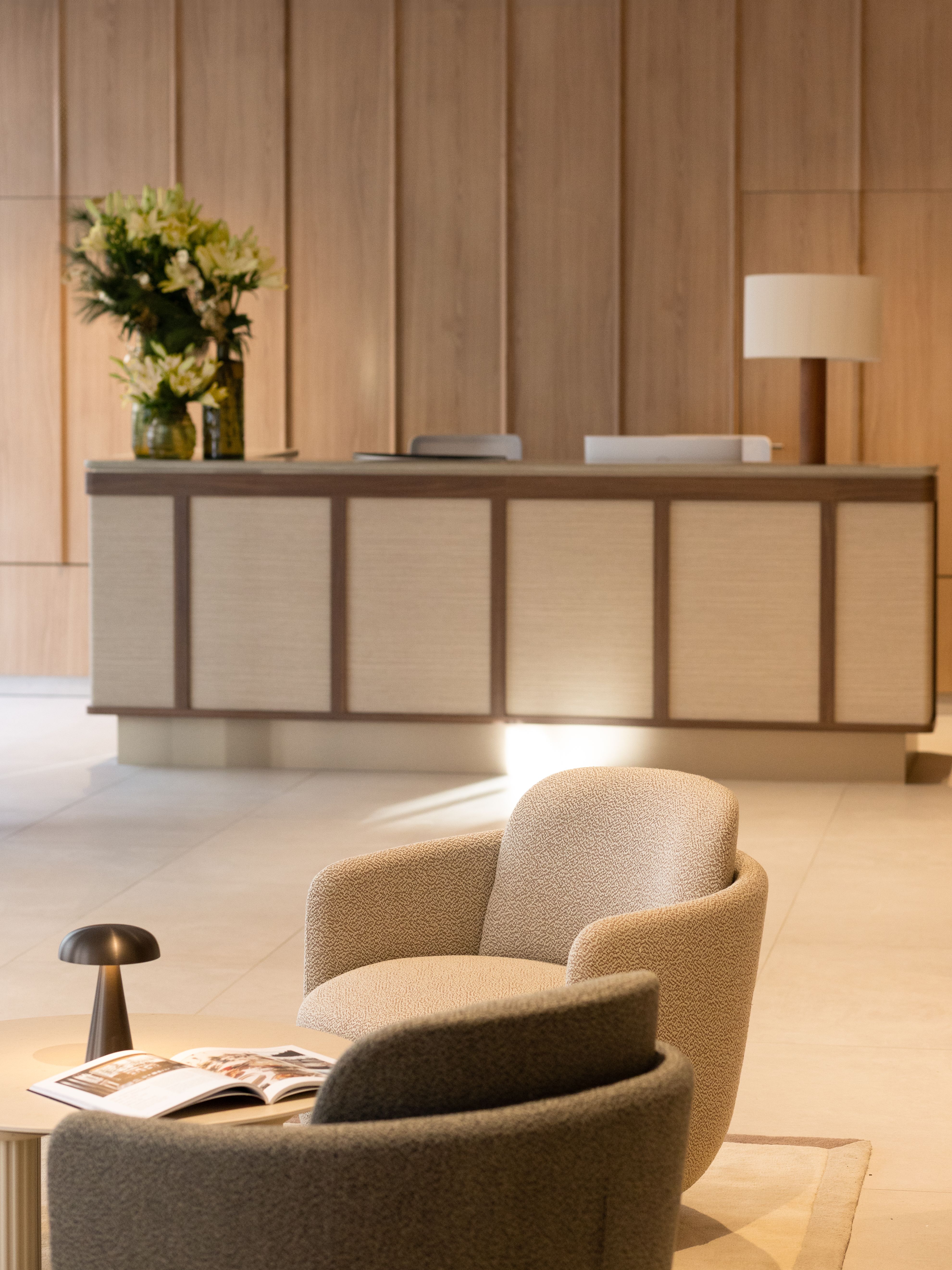 La réalisation d’un escalier monumental reliant la réception et le Patio a permis la transformation de ce lieu sombre et délaissé en véritable coeur de l’immeuble.