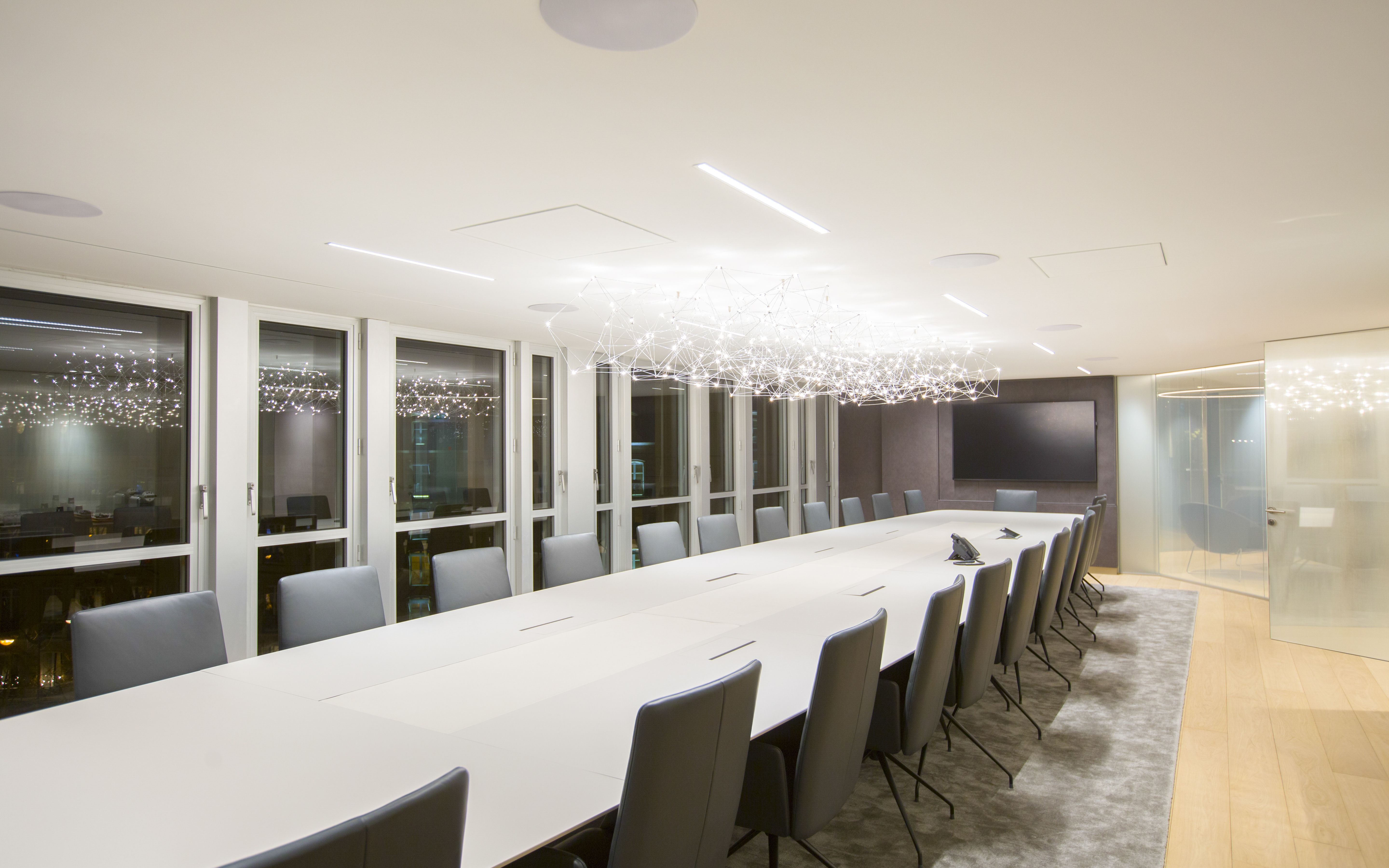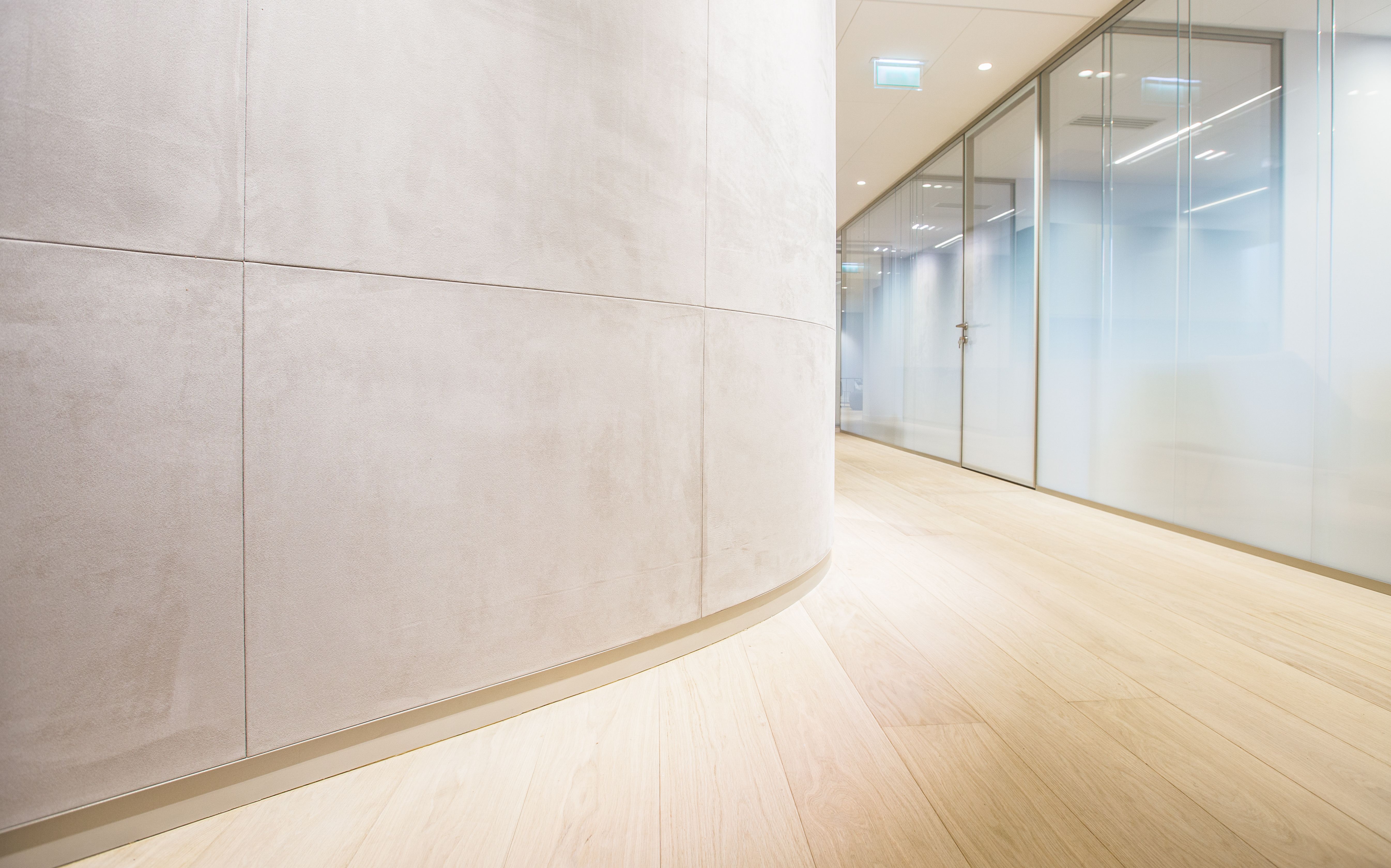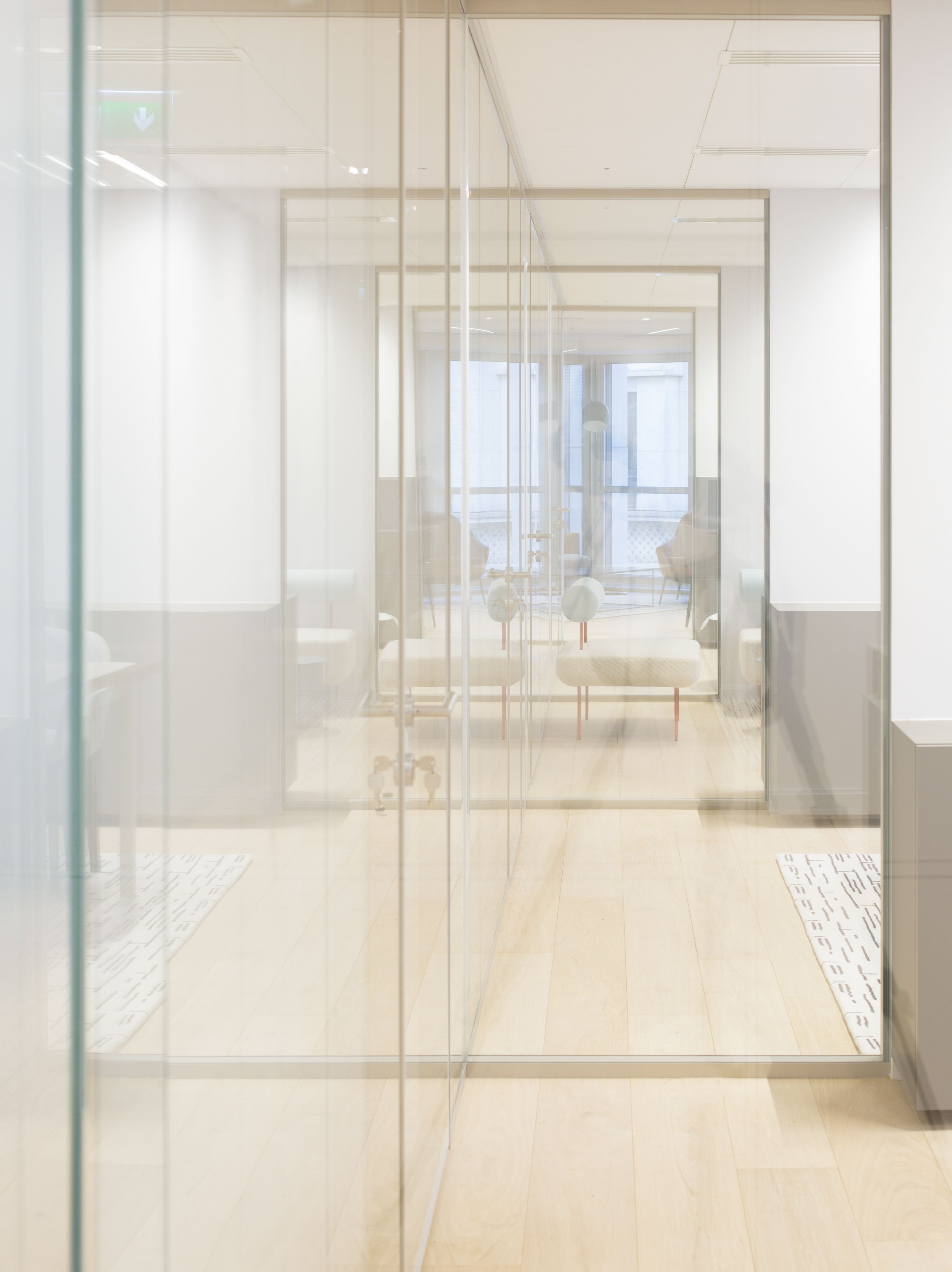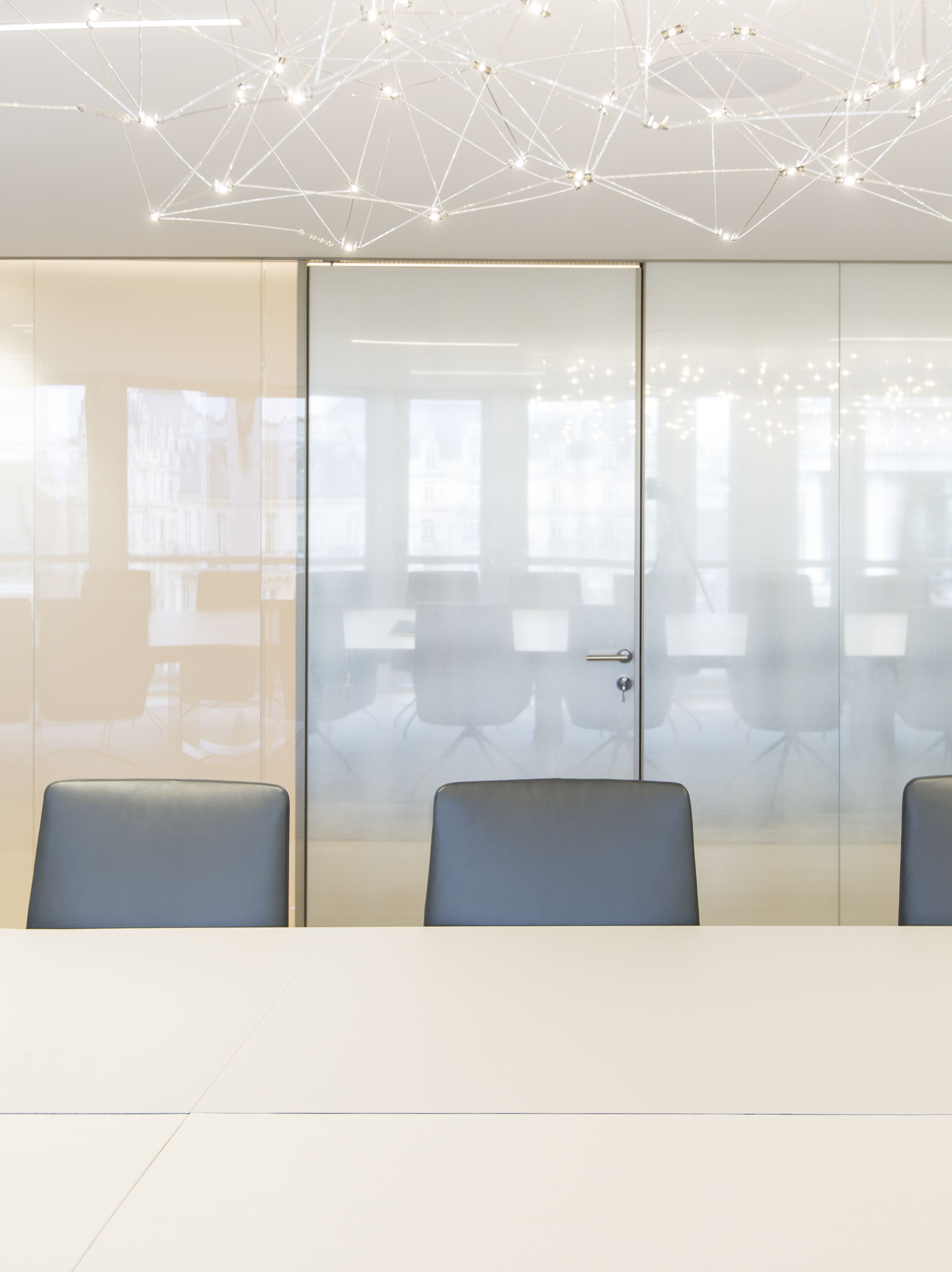 1 000 m² d’espaces poétiques et fonctionnels avenue Georges V: le reflet d’une nouvelle image de marque. Le nouveau siège de cet important fonds d’investissement Parisien se devait d’être à la fois la vitrine d'excellence et de modernité de l’entreprise et un lieu de travail serein et motivant pour l’ensemble des collaborateurs et associés. L’association du verre texturé et dégradé, du cuir, du bois, et de la lumière avec les potentiels architecturaux du bâtiment, a permis de créer un lieu fluide, lumineux, et ouvert sur Paris.