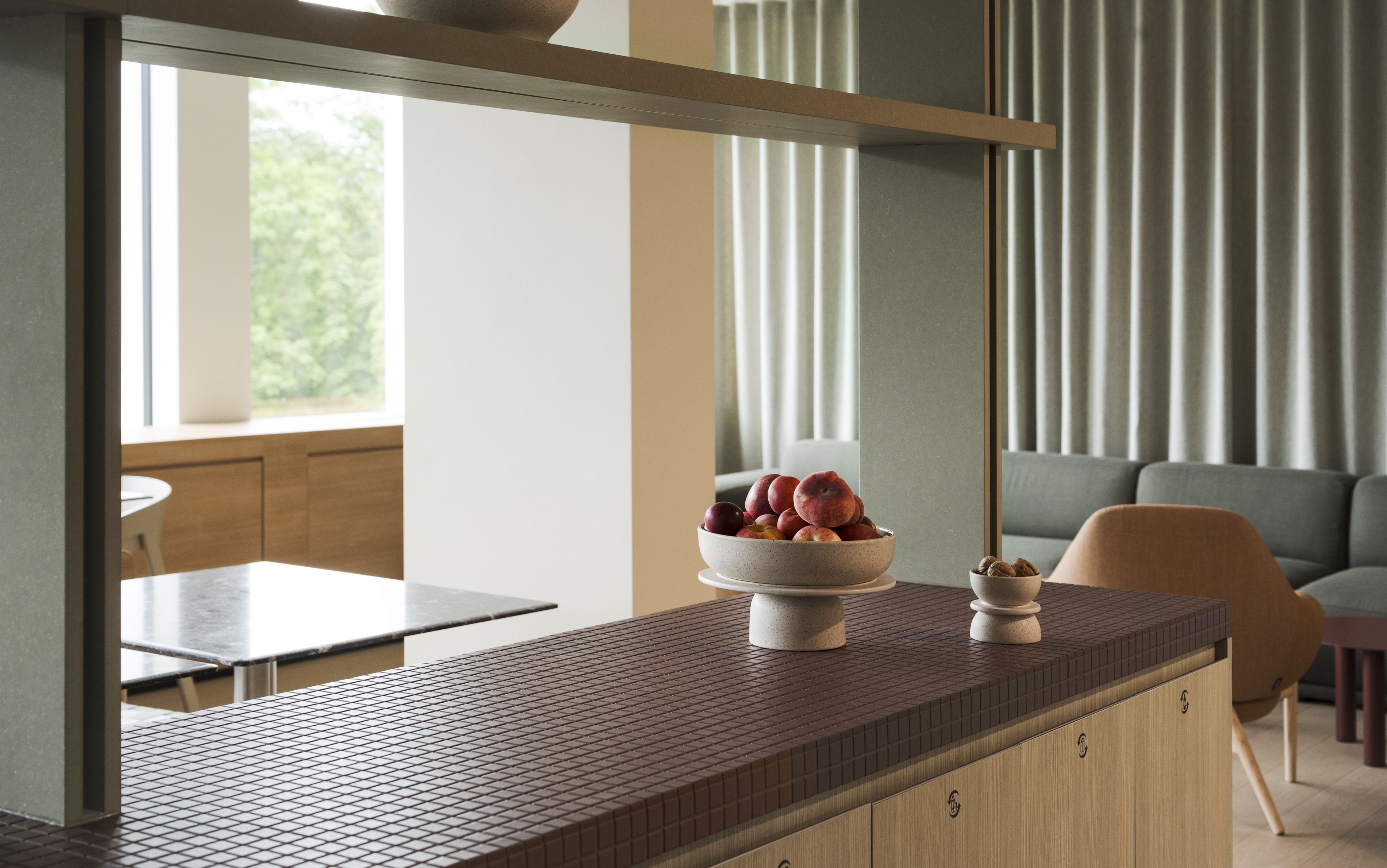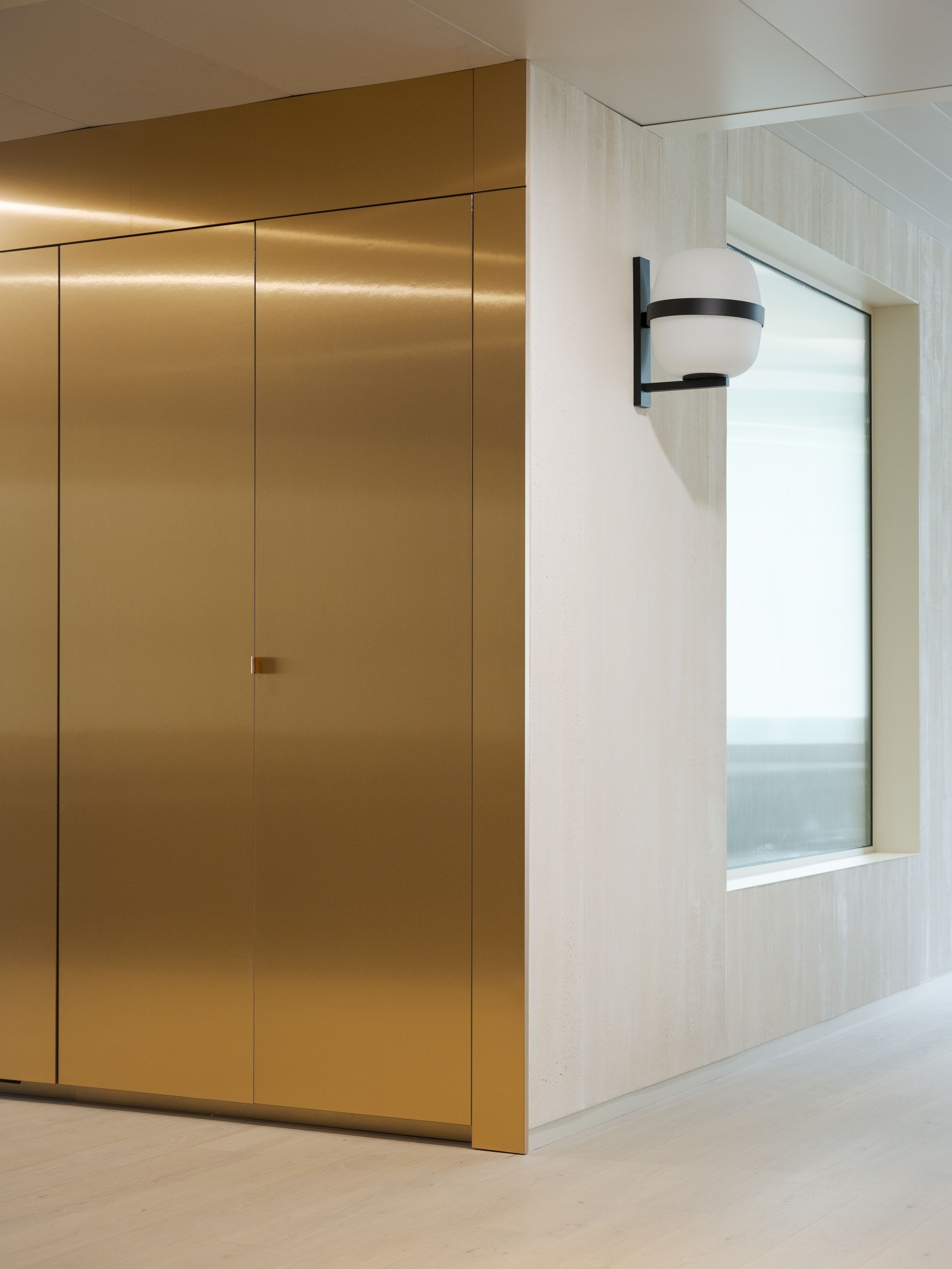 Des volumes simples faits de cuivre brossé, de verre structuré et de couleurs tranchées se rencontrent pour créer une richesse de points de vue et d’espaces à vivre.
